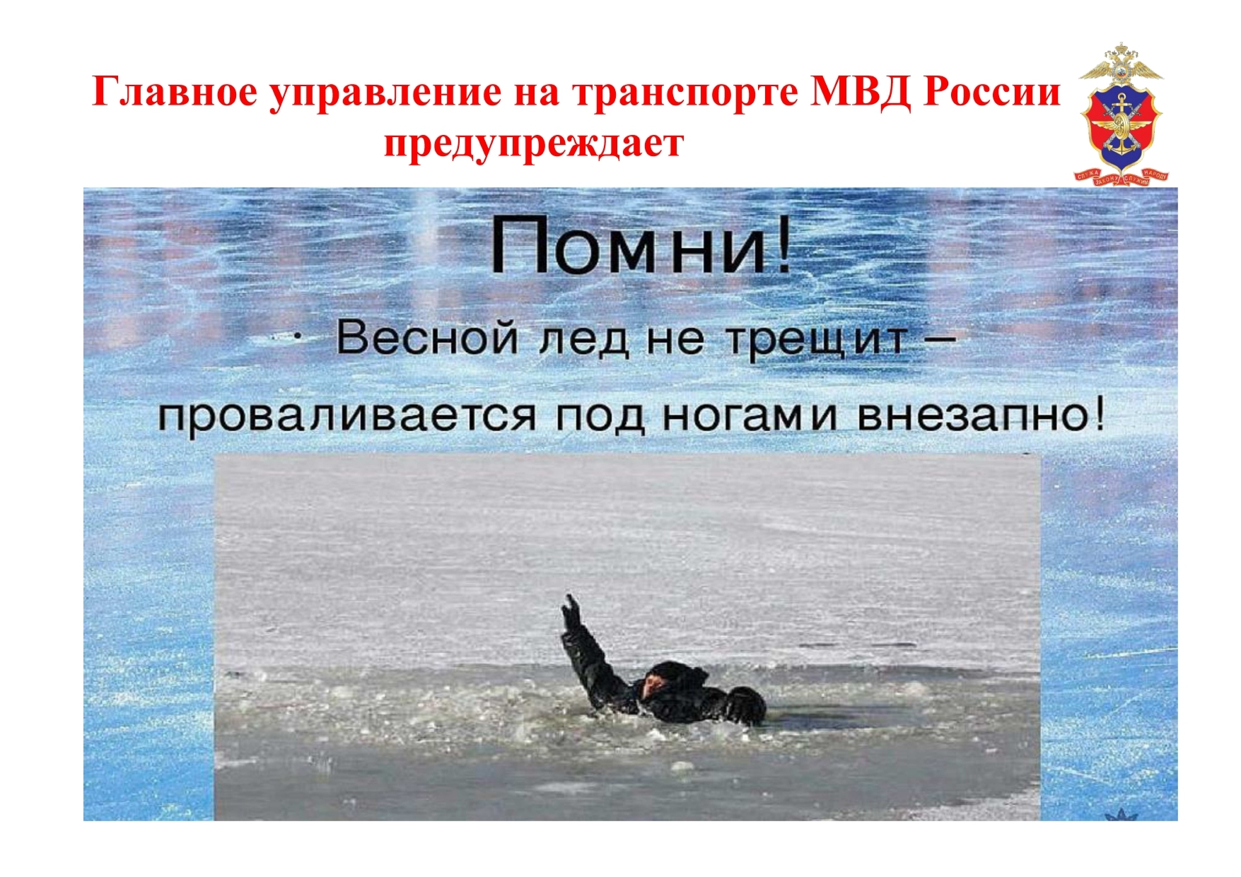 В целях предупреждения несчастных случаев с несовершеннолетними в период тонкого льда и ледохода размещаем памятки о правилах поведения на водных объектах, разработанные Главным управлением на транспорте МВД России.