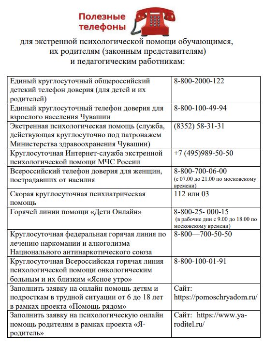 ? Дополнительно сообщаем, что обучающимся, их родителям (законным представителям) и педагогическим работникам бесплатную и анонимную экстренную психологическую помощь можно получить следующим образом: